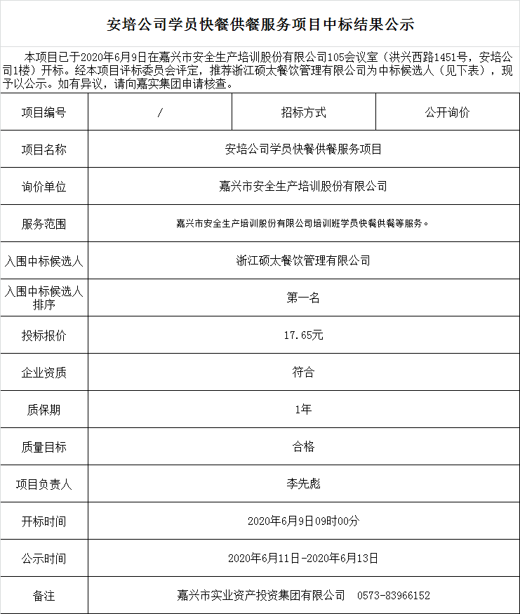 安培公司學(xué)員快餐供餐服務(wù)項(xiàng)目中標(biāo)結(jié)果公示