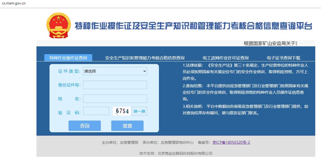 (二)對于新版證書?墒褂谩疤胤N作業(yè)操作證及安全生產(chǎn)知識和管理能力考核合格信息查詢平臺”或微信公眾號“國家安全生產(chǎn)考試”查驗證書真?zhèn)巍?BR>        1.使用“特種作業(yè)操作證及安全生產(chǎn)知識和管理能力考核合格信息查詢平臺”查驗新版證書步驟同查驗舊版證書步驟。