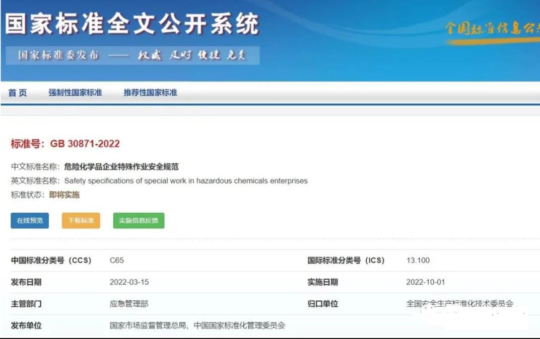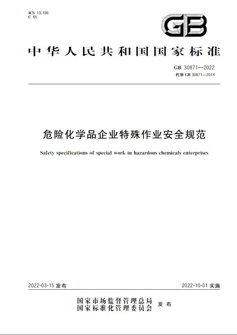 2022年3月,應(yīng)急管理部組織修訂的國家標準《危險化學品企業(yè)特殊作業(yè)安全規(guī)范》(GB 30871-2022)已正式發(fā)布,將于2022年10月1日實施。