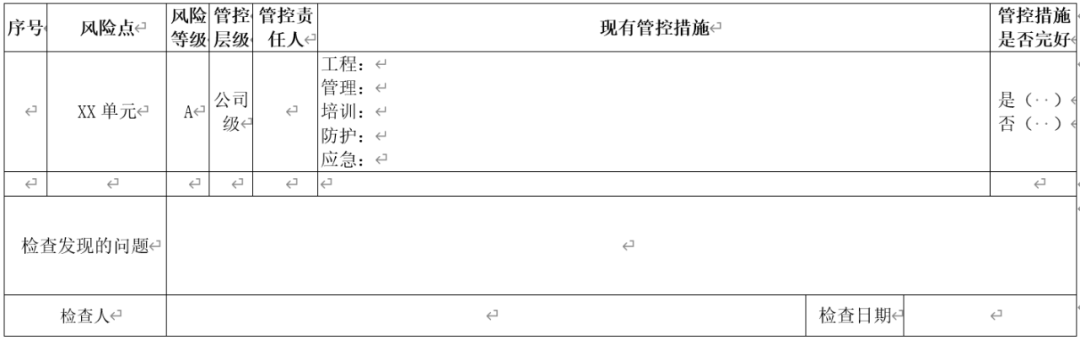 結(jié)合前文所述風(fēng)險與隱患的關(guān)系,企業(yè)應(yīng)對各風(fēng)險點的現(xiàn)有管控措施通過隱患排查等形式進行管控。最理想的做法是在對風(fēng)險分級管控的基礎(chǔ)上,明確風(fēng)險點及管控措施,列出詳細的隱患排查清單,對風(fēng)險點的各類管控措施進行隱患排查,確保管控措施有效。