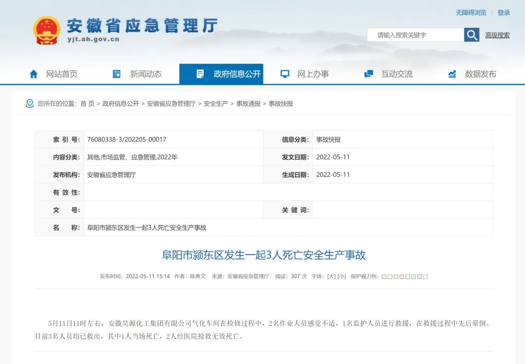 據(jù)安徽省應急管理廳網(wǎng)站消息:5月11日11時左右,安徽昊源化工集團有限公司氣化車間在檢修過程中,2名作業(yè)人員感覺不適,1名監(jiān)護人員進行救援,在救援過程中先后暈倒。目前3名人員均已救出,其中1人當場死亡,2人經(jīng)醫(yī)院搶救無效死亡。