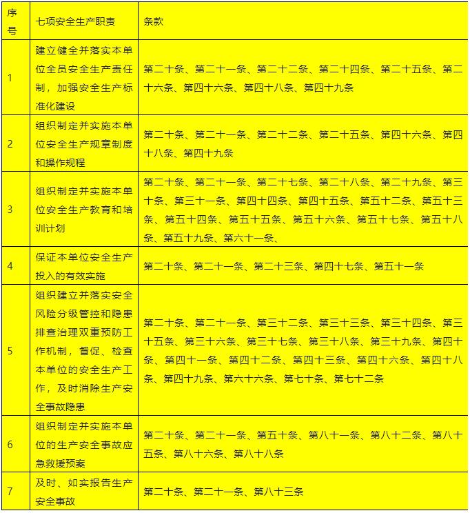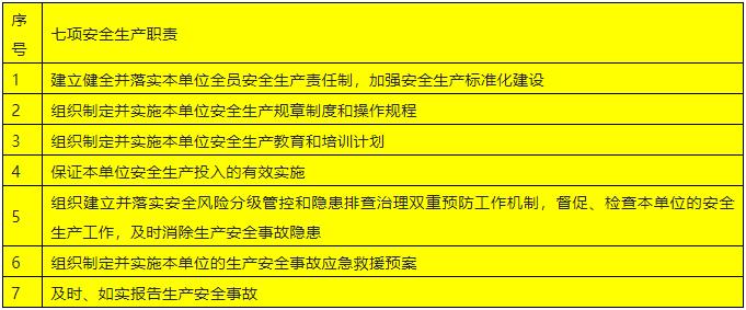 企業(yè)主要負(fù)責(zé)人法定七項安全生產(chǎn)職責(zé)內(nèi)容見下表: