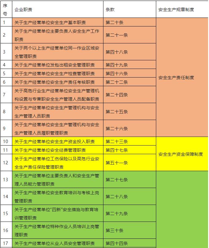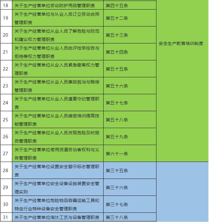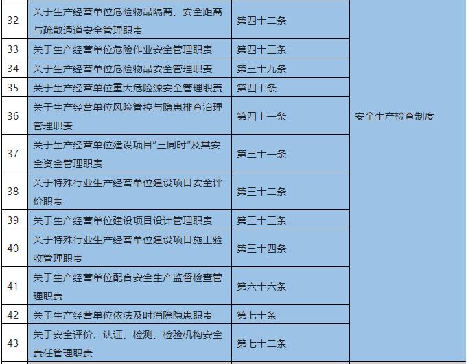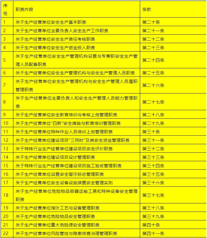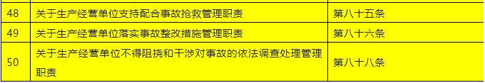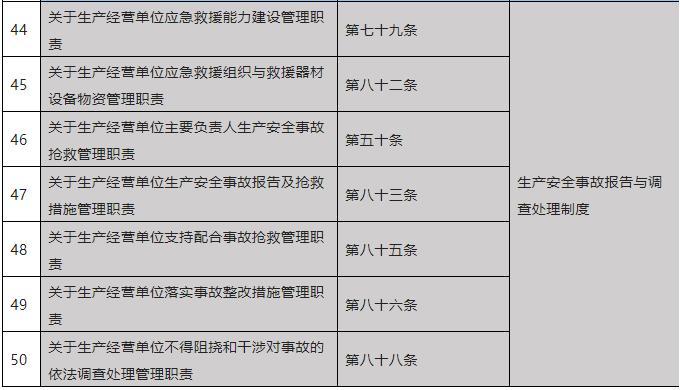 生產(chǎn)經(jīng)營單位主要負(fù)責(zé)人七項安全生產(chǎn)職責(zé)與生產(chǎn)經(jīng)營單位安全生產(chǎn)“50條職責(zé)”存在對應(yīng)的關(guān)系,如下表所示: