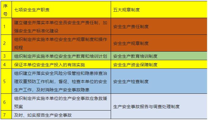 以生產(chǎn)經(jīng)營單位主要負(fù)責(zé)人七項安全生產(chǎn)職責(zé)來講,亦可歸納為五大制度,均可歸結(jié)為安全生產(chǎn)規(guī)章制度,如下表所示: