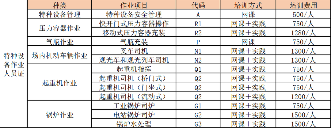 二、報(bào)名注意事項(xiàng) 1.報(bào)名材料:身份證復(fù)印件一份,二寸白底照片2張,身體健康證明(體檢報(bào)告)一份(報(bào)考叉車、觀光車、鍋爐水處理需要提供),申請(qǐng)表一份(單位蓋章)。 2.報(bào)名條件:18—60周歲身體健康。 3.證書(shū)期限:每四年內(nèi)復(fù)審一次。