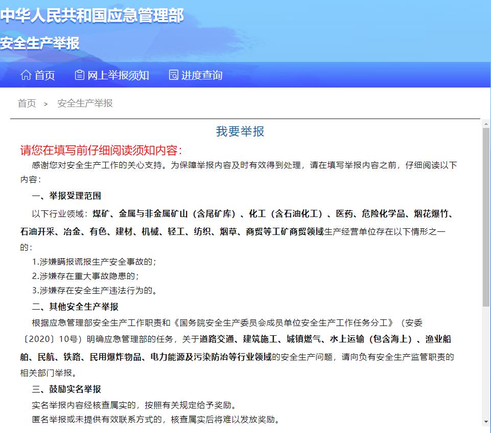為做好安全生產(chǎn)舉報工作,為社會公眾和企業(yè)員工提供便捷、快速、有效的舉報渠道,應(yīng)急管理部組織開發(fā)的“安全生產(chǎn)舉報系統(tǒng)”于日前上線試運行,以發(fā)動各方面力量群策群力參與安全生產(chǎn)共治,有效防范遏制重特大事故發(fā)生。